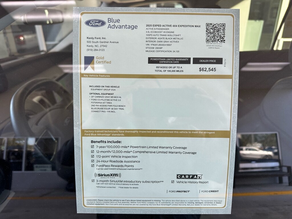 *** Please call, text, or visit JOE HUSICK at x227 or mobile (919) 795-9577 up to 9PM *** Ford GOLD Certified with extra Ford backed warranty and benefits included. 2-keys/remotes and just completely serviced. 20-inch wheels, FORD CO-PILOT360 ACTIVE 2.0, 2nd row 40/20/40 power fold bench seat, 60/40 split power fold 3rd row seats, 24-inch pano display, 13.2-inch center touchscreen, and more ....................................................................................................................................................... ............................................................................................................................ *** With twenty years experience here at Kenly Ford I assure you the highest level of integrity and professionalism. Extra effort has been made to provide accurate and reliable details and multiple photos showing the actual vehicle in natural light when possible. Ad space is limited but my time is not so please ask for me by name when calling or visiting. Thank you! Joe Husick***